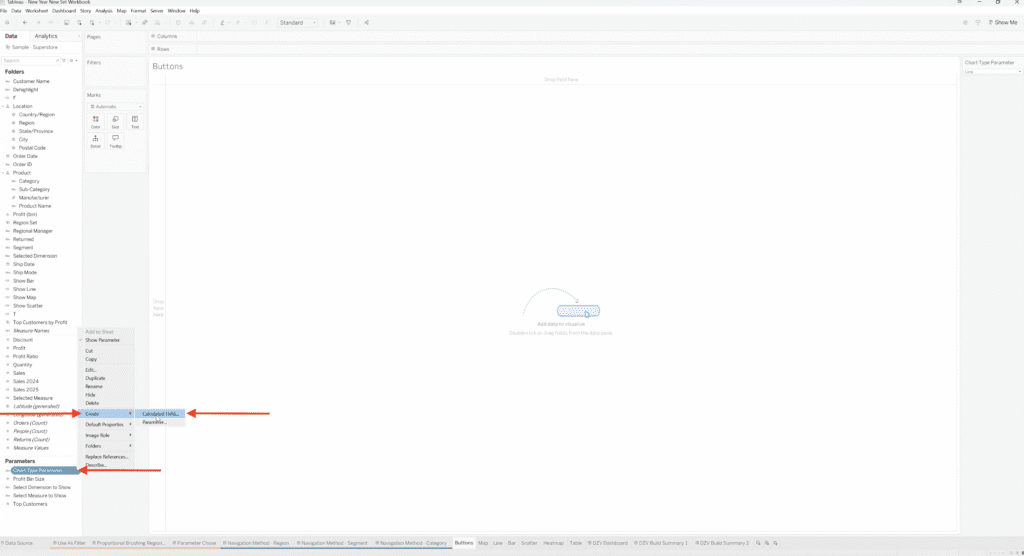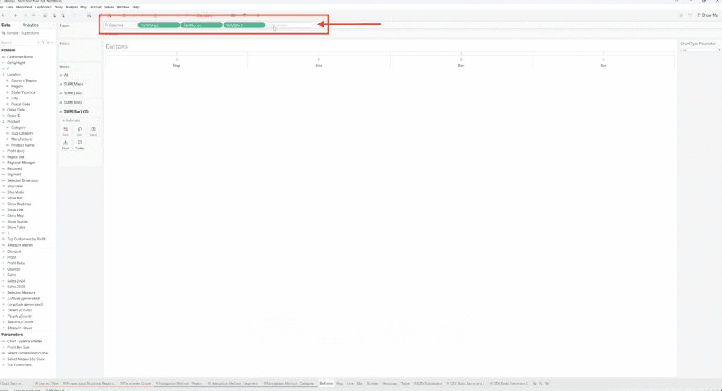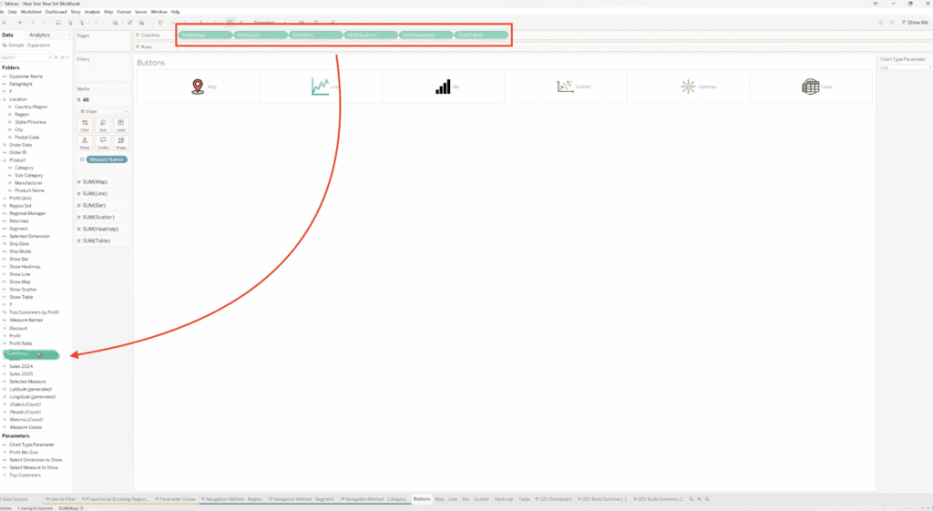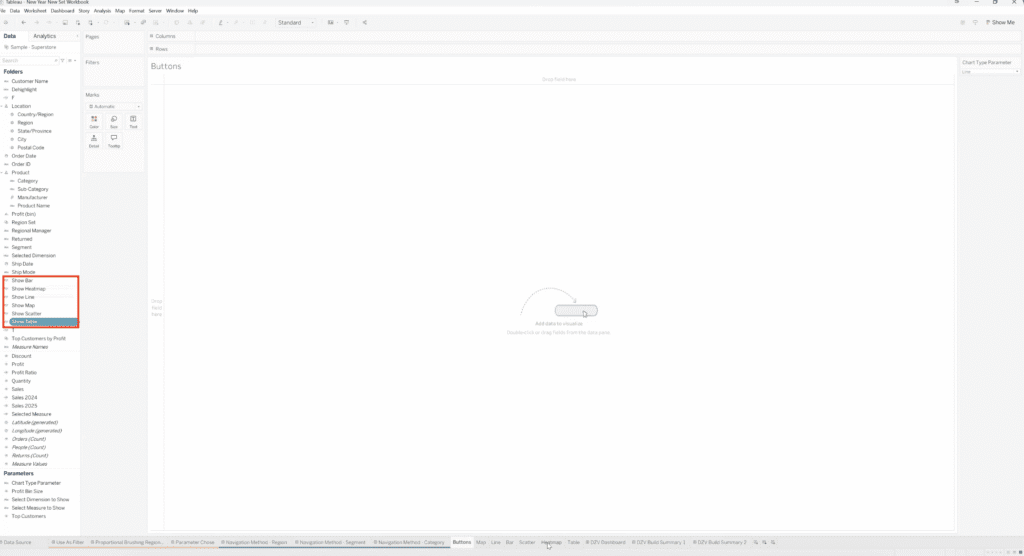 Create the set of worksheets you want to toggle between (in this tutorial we use: Map, Line, Bar, Scatter, Heatmap, Table).