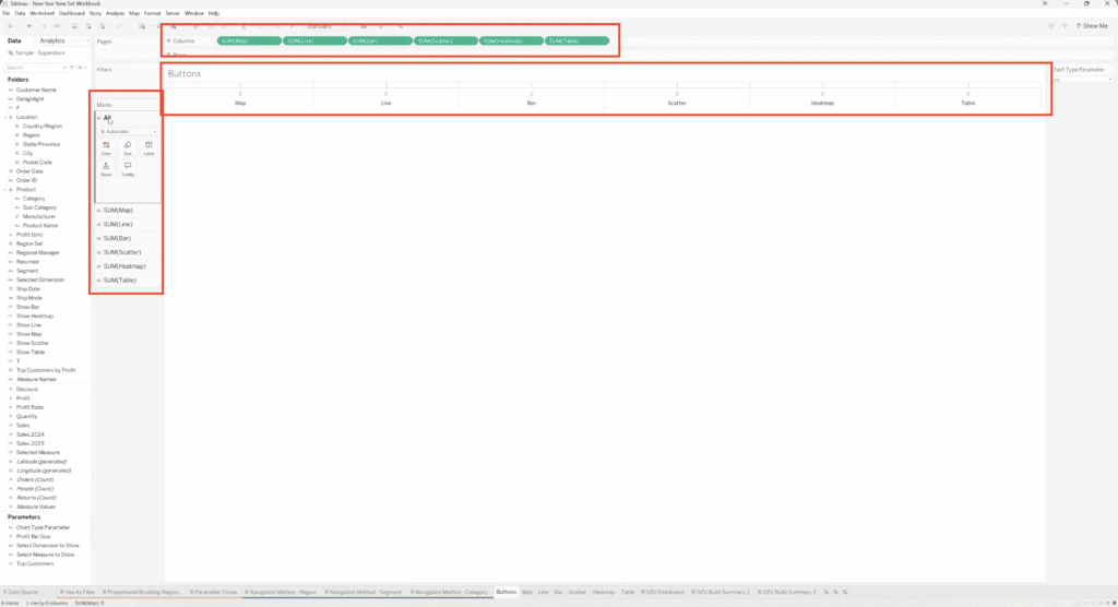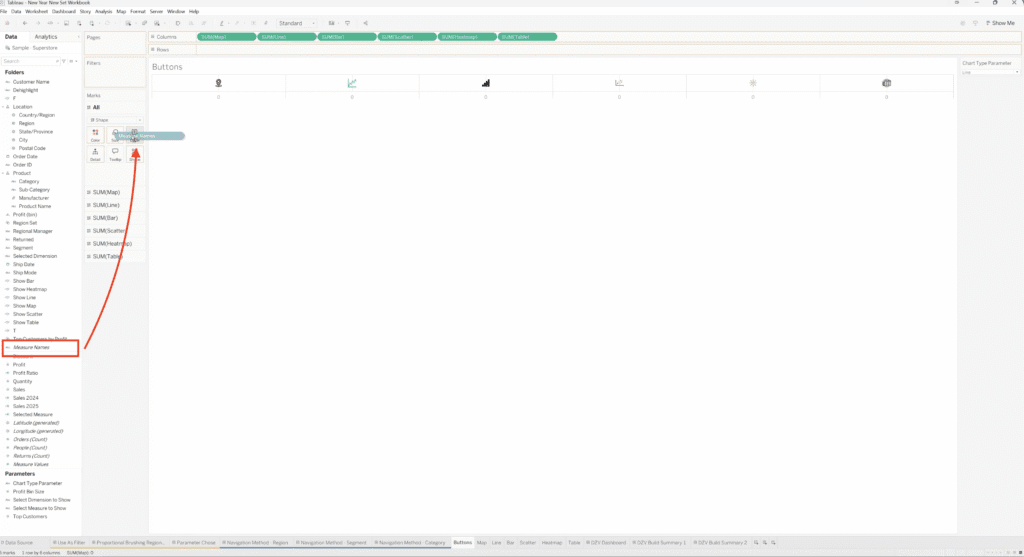 - On the Buttons sheet, make sure each dummy measure has its own Marks card.