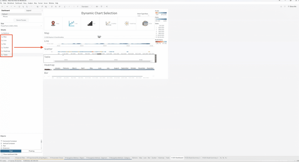 I’m using Containers for… One for the Buttons and a separate one for the Worksheets. I move the Chart Type Parameter to the Header just so that I can keep an eye on it, use it more like an Audit here. Have it into… have my Buttons fit the Entire View, and I’m gonna layer into this lower Container all of the Worksheets that are gonna be referenced in the lower section. So going over to make that assignment, you can see that the Container contains all of ’em. I’m verifying that. [00:07:00] Sometimes they tend to wanna slip out, so you wanna make sure that they all are contained by that Container.