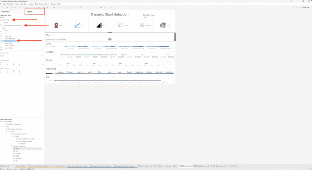 And then, go in one by one and assign your Boolean value of “Show Line,” “Show Map” to the corresponding Chart. And as you select ones that are not what is currently being selected by your Chart Type Parameter, they should disappear.