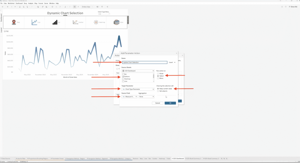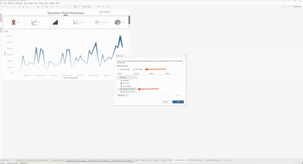7. Add a Parameter Action so icon clicks update the Chart Type parameter