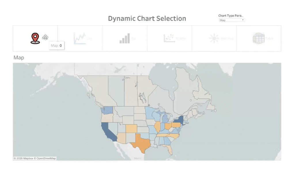 In this Tableau Tips & Tricks tutorial, you’ll learn how to combine parameters, parameter actions, and Dynamic Zone Visibility to build an interactive chart selector that lets users toggle between views like maps, line charts, bar charts, scatter plots, heatmaps, and tables, all within the same dashboard space.